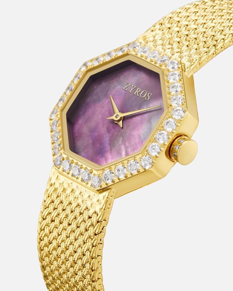 - ميناء الساعة باللون الأرجواني بشكل هندسي يتزين بعدد من فصوص الزركون على إطار الساعة