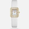 تحفة زمنية تتحدث بلغة الأناقة ، ساعة بتصميم فاخر يجمع بين البريق الذهبي للإطار وسحر تصميم الميناء الهندسي ، تتلألأ حوافها بفصوص براقة كالنجوم في ليلة ساحرة ، انها أكثر من مجرد ساعة أنها تعبير راق للذوق الرفيع
